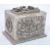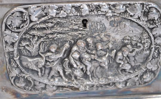 A 19th century Victorian silver electrotype casket. Of square heavy form having exceptional repousse relief work panels with scenes of moorish hunters and beasts with mounted soldiers, tigers etc to the hinged lid. To centre front, scene of mythical nature of musician Satyrs leading bull and bloated rider in woodland, the sides with cherub winged putti and angels. The inside with lined trays of 3 forms. Measures 13cms high x19cms wide x 13cms depth