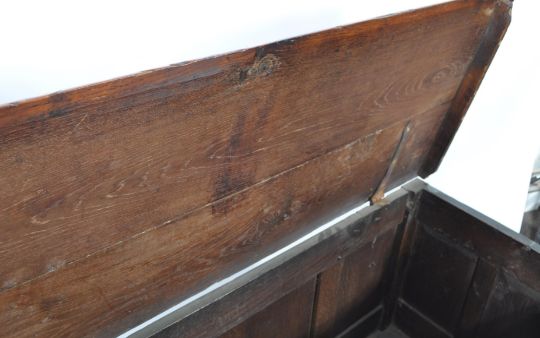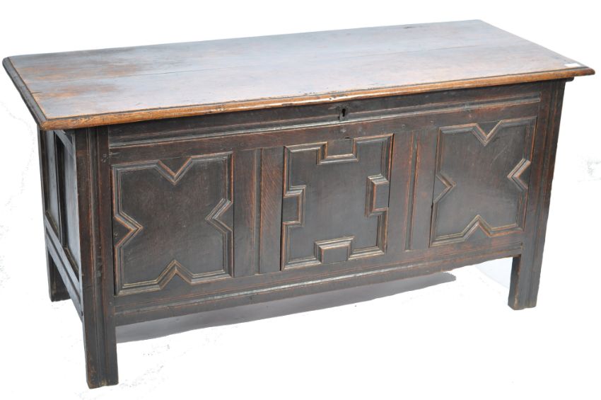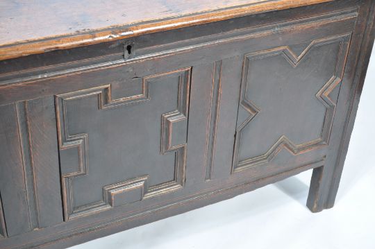 An 18th century carved oak coffer chest raised on bracket feet having a series of fielded geometric pattern panels with hinged top above. The inside complete with hinged top candle box. Measures 139cm x 68cm high.