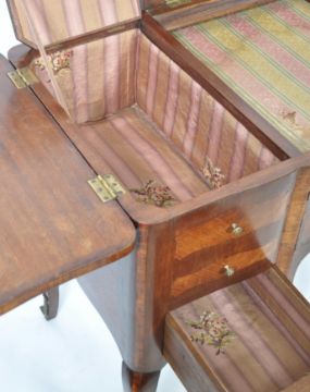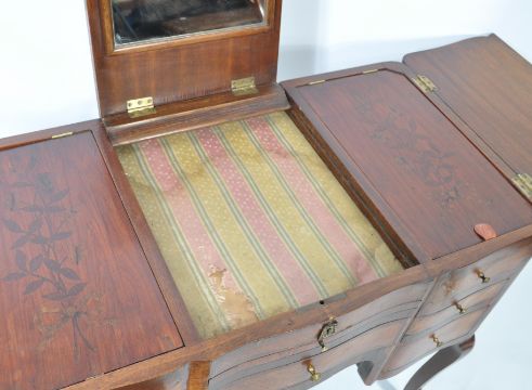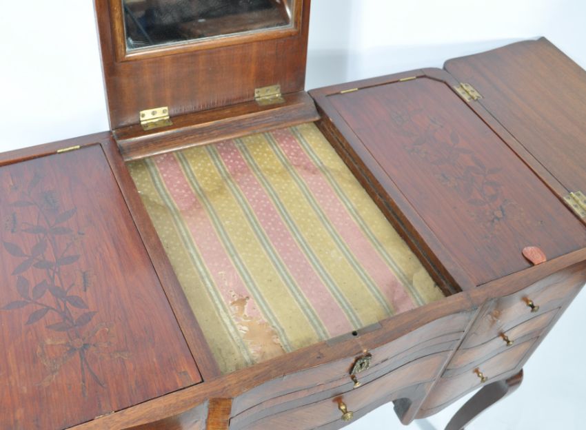 A 19th century French Louis XV revival mahogany and kingwood Poudreuse ladies dressing table. Raised on shaped cabriole legs with ormolu sabot feet above a central kneehole recess flanked by a series of 4 drawers with  triptych hinged dressing table top with central rise and fall hinged mirror door flanked by side lifting cabinets with inset marquetry inlaid panels over further appointed interiors.