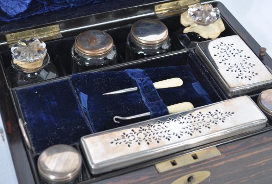 A 19th century coromandel and brass bound decanter ladies travelling dressing table box. Of square form with the hinged lid inset with a lined interior enclosing fully appointed interior. Measures 17cms high x 28cms x 21cms