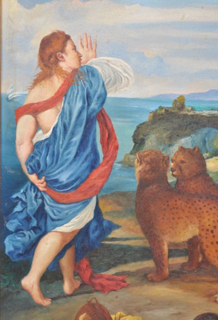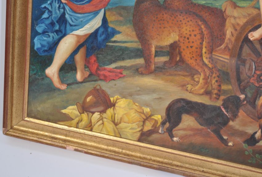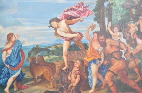 After Tiziano Vecellio, called Titian, a large oil on canvas painting of Bacchus and Ariadne depicting Bacchus, god of wine, emerges with his followers from the landscape to the right. Falling in love with Ariadne on sight, he leaps from his chariot, drawn by two cheetahs, towards her. Ariadne had been abandoned on the Greek island of Naxos by Theseus, whose ship is shown in the distance. The picture shows her initial fear of Bacchus, but he raised her to heaven and turned her into a constellation, represented by the stars above her head. Set to an plain gilt frame. 132cm wide x 104cm high.