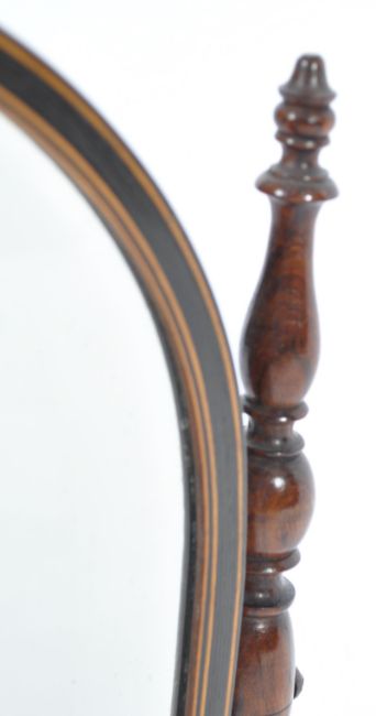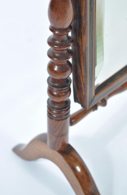 A 19th century quality rosewood dressing table mirror being raised on splayed legs united by a bobbin turned stretcher supporting turned column supports with central inlaid arched mirror housing bevelled mirror glass