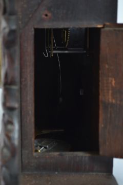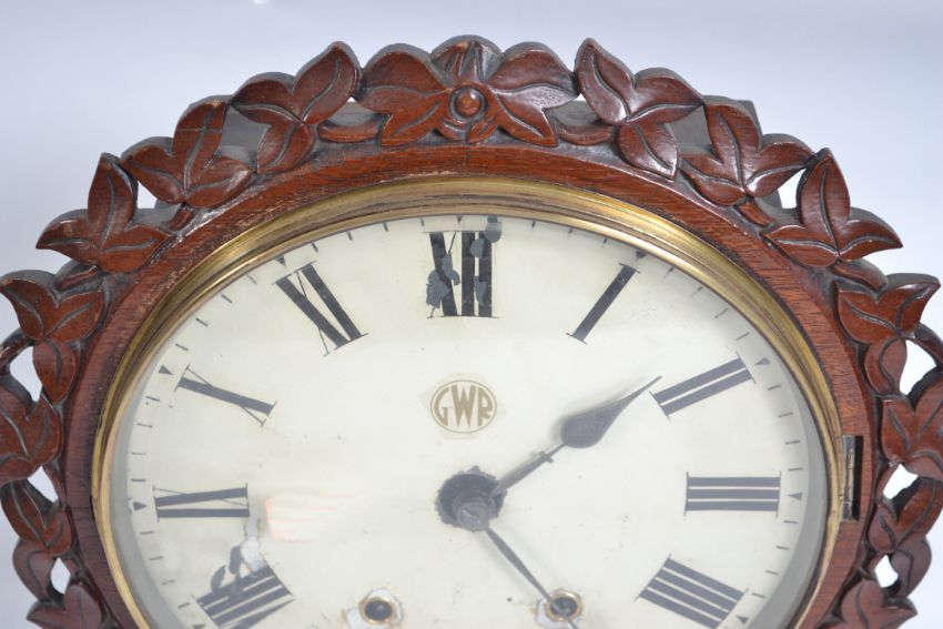 A GWR railway station clock set within a mahogany frame with flower head borders to the circular dial with plinth base. The diam with GWR markings having roman numeral chapter ring, 8 day brass movement and faceted hands. Measures 46cm high x 41cm wide.