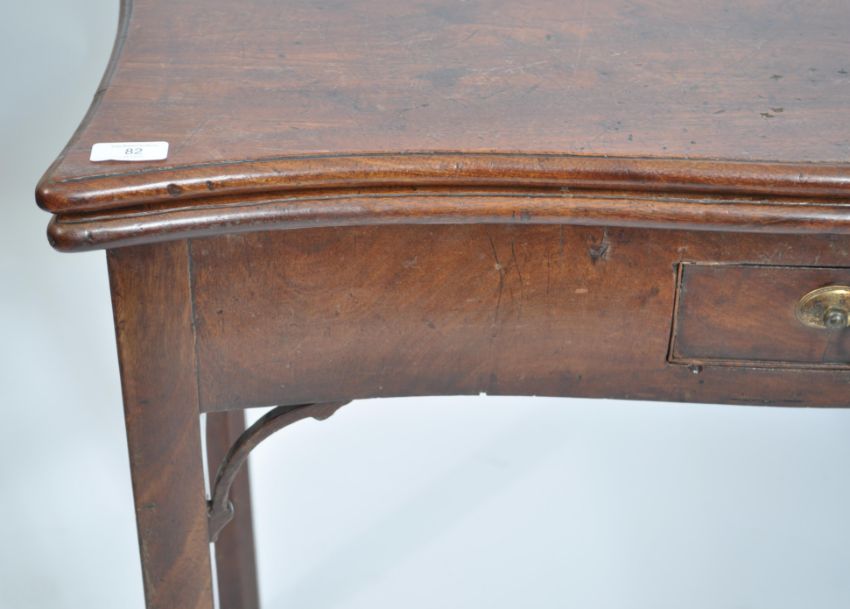 An 18th century Georgian solid mahogany fold over tea / games card table having a serpentine edge with double fold out back leg, raised on canted corner squared legs. H73cm x W90cm x D46cm