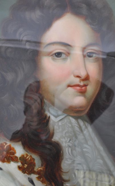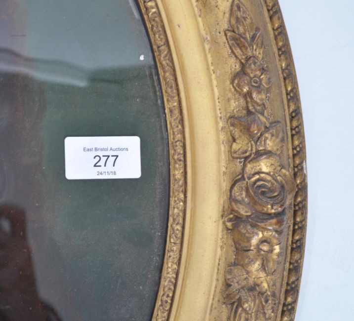 A good 19th century English School reverse painting on glass depicting a long haired young gentleman figure and being set within an oval gilt frame. Measures 59cm x 51cm.