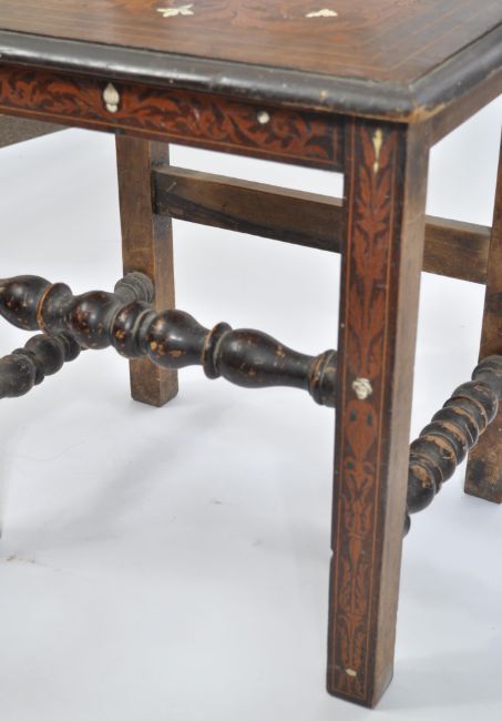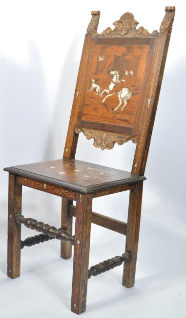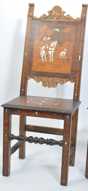 A pair of 19th century Italian bone and marquetry inlaid walnut hall /  side chairs. The chairs raised on seaweed squared legs united by bobbin stretchers having swag and bone inlaid panel seats with stunning panel backs inlaid with bone and veneers depicting huntsman on horse with dog chasing fowl in wooded scenes. Finished with carved top rails to each. H125cm x W50cm