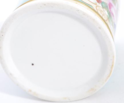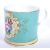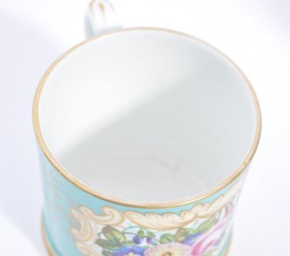 A 19th century, possibly Coal port or Derby commemorative wedding mug / loving cup being decorated with a variation of the ' Marriage ' pattern in a cartouche panel and set to a blue ground with gilded borders. Measures 8cm high x 10cm wide.