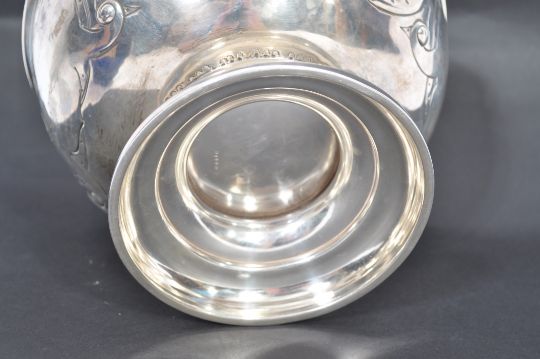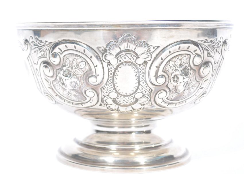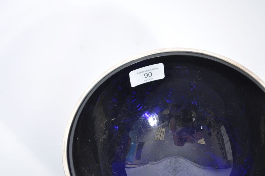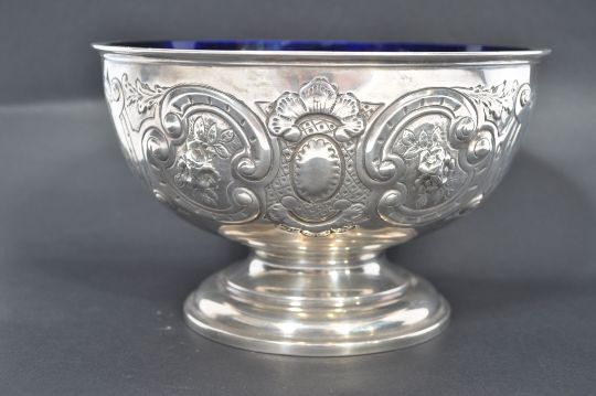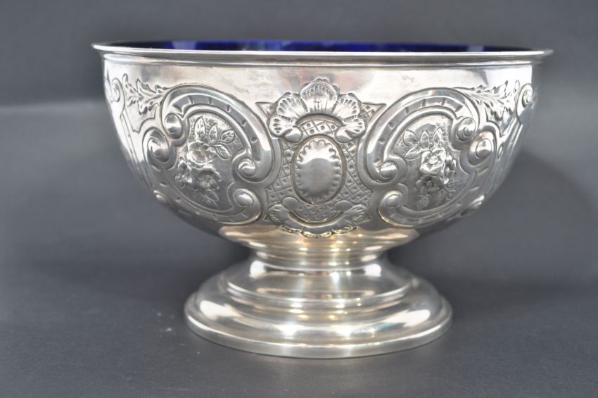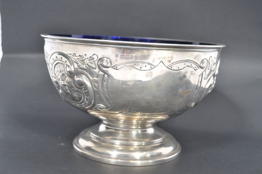 A large silver hallmarked fruit bowl with Bristol blue glass liner. The large bowl cast in relief with scrolls and plain cartouche panels. Hallmarked for James Deakin & Sons -John & William Deakin, Sheffield 1903. Weight approx 460g. 14cm tall x 22cm diameter.