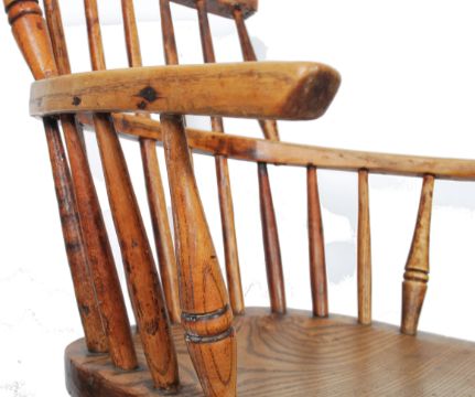 A 19th century country elm childs high chair. Raised on turned legs with h-stretcher having an elm saddle seat with turned rail bobbin back, shaped top rail and hoop elbow rests. Measures 85cms high x 42.5cms depth