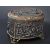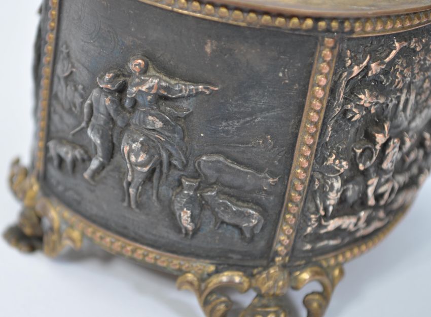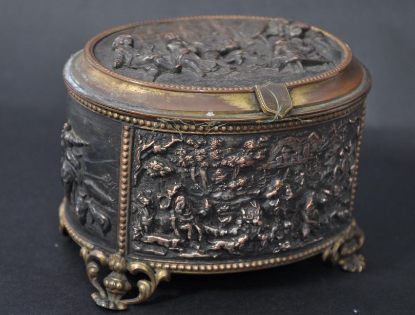 A 19th century French gilded ormolu copper jewellery casket of oval form. The top, front, sides and back are beautifully cast and feature panels of medieval scenes of revellers hunting and feasting. The hinged top revealing original lined interior. Sstamped  to base for T & E, Paris. The copper casket with remains of gilding over copper giving a fabulous patina. Measures 8cms high x 11cms wide