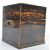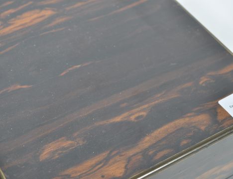 A 19th century coromandel and brass bound decanter box - celerette. Of square form with the hinged lid inset with a vacant brass cartouche over enclosing four square section canted decanters. Three decanters believed original, one replaced. Measures 25cms high  x 22cms wide x 22cms depth