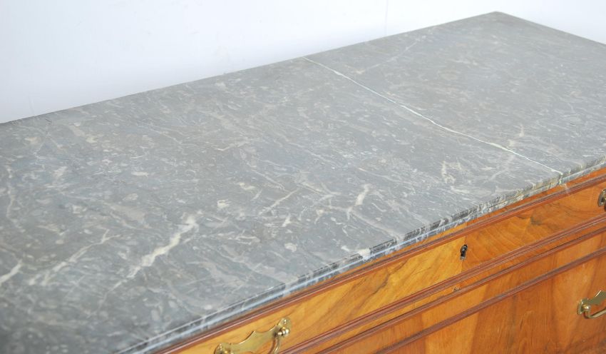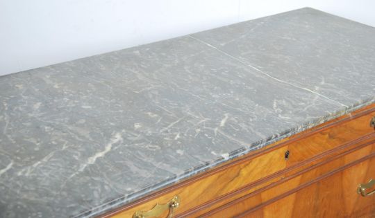 A 19th century French walnut  and black/grey veined marble commode chest of drawers being raised on bracket feet supports with central bank of drawers. All having decorative brass handles and key escutcheons. Atop a large flared black and grey veined marble top. The marble to top having had 2 old repairs however solid ( 1 piece), amazingly well restored, smooth to the touch and not immediate to the eye ( see illustrations )  Measures 100cm high x 125cm wide and 556cm deep.