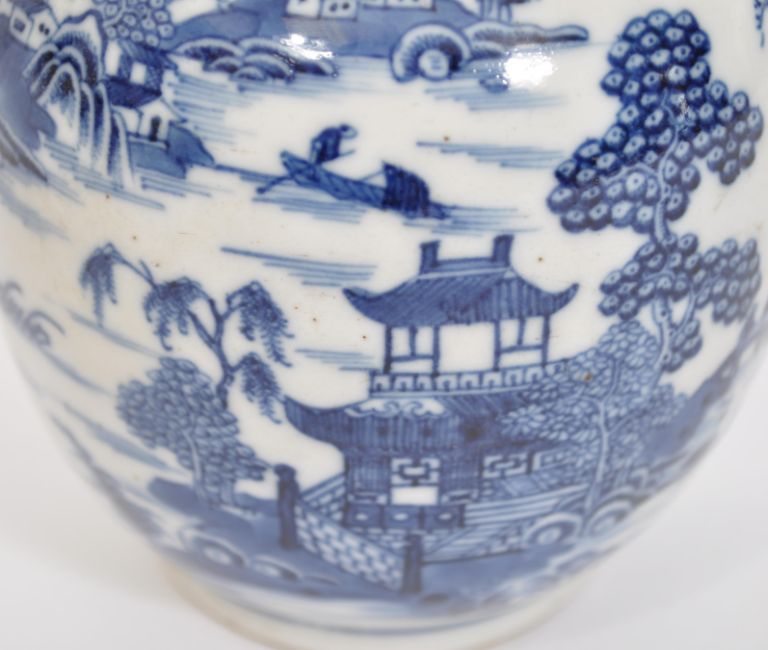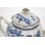 An 18th century Chinese blue and white teapot in the willow pattern. The teapot with scene of fisherman and 2 men on the bridge centre. With lid having finial crown. Unsigned to the base. Measures 6 1/2 cm.