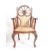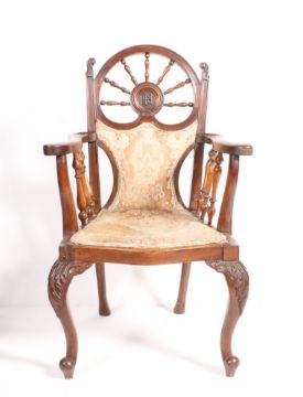 A matched pair of 19th century believed teak wood salon carver armchairs possibly from a ship / liner of 1st or 2nd class. One chair with missing plaque to rear verso and having central monogram BH. Each raised on cabriole legs with pad feet, upholstered seats with scrolled elbow rests and having carved wheel back rests. Measures 56cm wide x 94cm high.