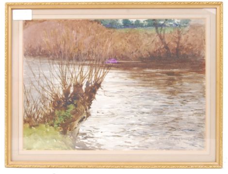 Norman Wilkinson, CBE RI, watercolour painting of a river bank with reeds and flowing river depicted. Signed in the lower corner. Framed and glazed.  Wilkinson was famed for his painting 'Plymouth Harbour' which was situated in the First Class Smoking Room aboard RMS Titanic and perished when the ship went down. He also invented Dazzle Camouflage for ships in WWI (including Titanic's Sister Ship RMS Olympic). After the war he was responsible for much of the artwork featured on railway and travel posters. Measures are 43cm wide x 33cm high.