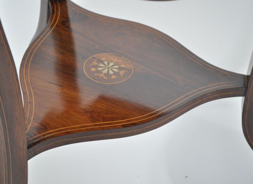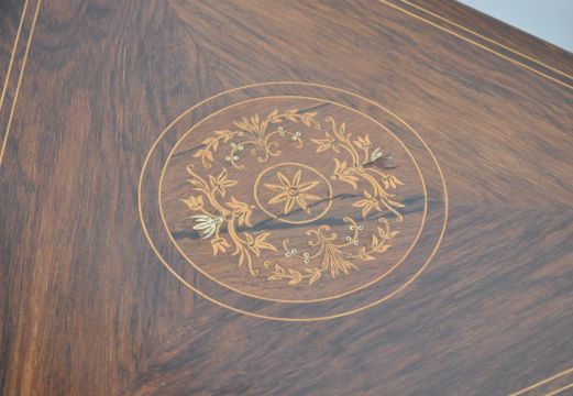 A late 19th / Edwardian rosewood inlaid envelope card table, the swivel top enclosing a green felt lined interior, decorated with swag and urn inlaid details, raised on tapering legs with under stretchers. Measures 58cm wide x 71cm high.