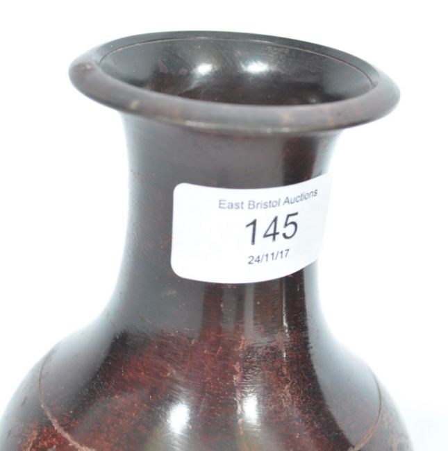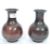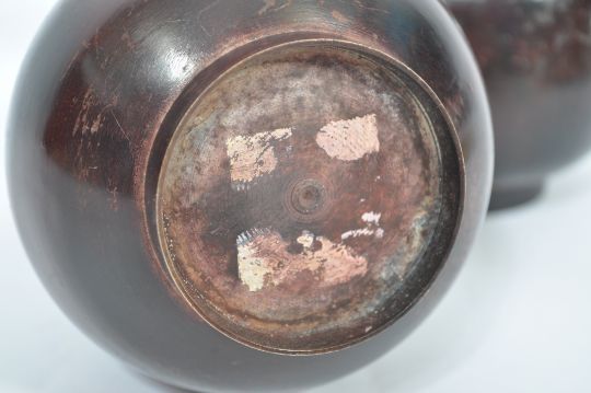 A pair of believed 19th century Japanese bronze and enamel painted oriental vases. Each of baluster form with waisted necks and trumpet rims. Finished with an ochre red enamel. Unmarked to the bases. Measures 18cm high