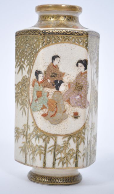 A pair of 19th century Japanese Satsuma vases of Octagonal form decorated with geisha panels, trees and geometric patterns elsewhere. Each stamped to the base. 15cm tall.