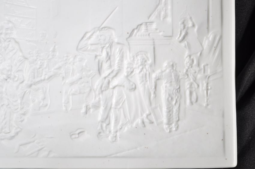A 19th century lithophane panel of an school room with a boy being beaten by the school master porcelain marks to verso with number 62454.. Measures 15cms by 20cms.