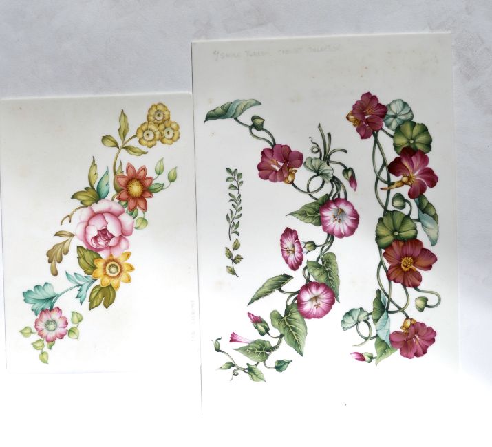 A rectangular porcelain plaque hand painted with floral spray's inscribed in pencil to the front '  c/sauce tureen cabinet collection ' and to verso in red paint ' Spode / Cab.Col.IV Soup Tureen '  Measures 24cms x 16.5cms wide. Together with another porcelain plaque with floral sprays with notation ' Enlarged 508 ' Measures 17.5cms x 12.5cms. Both believed to be pattern samples for Spode Porcelain