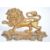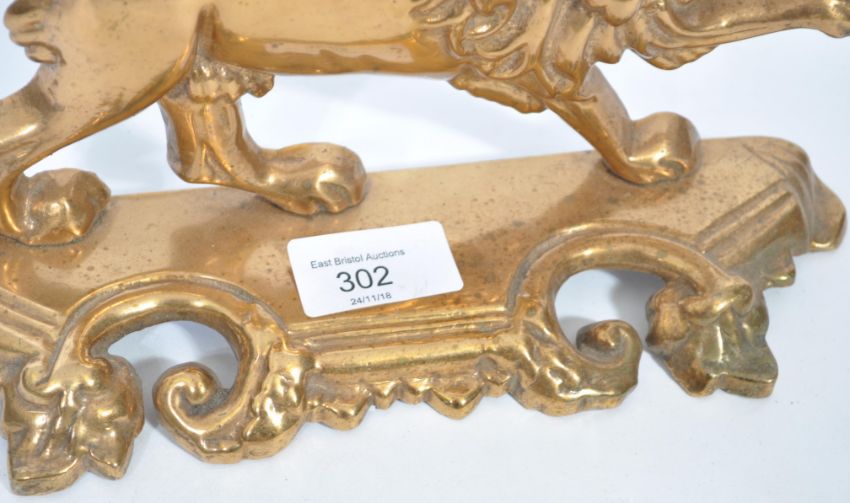 A pair of 19th century brass flat back fire side dog figurines in the form of lions. The lions raised on scrolled pedestal bases with raised front paw. Measures 17cm x 25cm.