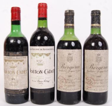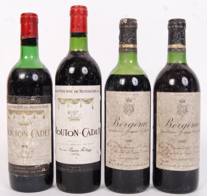 Four bottles of assorted vintage French red wine comprising of; 2x bottles of Bergerac 1980, Baron Philippe De Rothschild Mouton Cadet 1971 & Baron Philippe De Rothschild Mouton Cadet 1976. Bottle sizes 750ml. All bottles sealed.