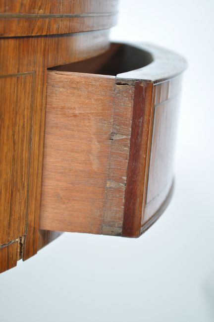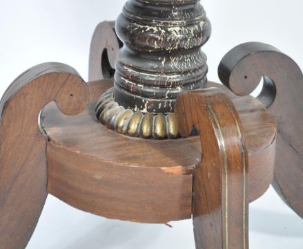 An 18th / 19th Century Georgian circular Indian rosewood rent table. The circular top fitted with tooled green leather top fitted with four drawers with alternating false drawers between,. All raised on turned pillar support with quadripartite and circular splayed leg support base. 75cms high x76cms diam