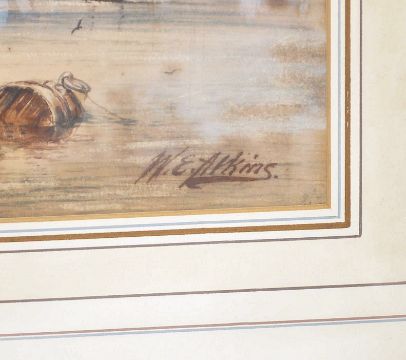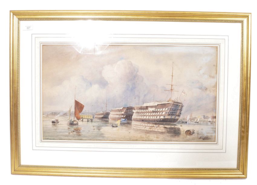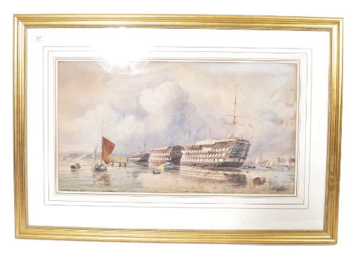 William Edward Atkins (British, 1842-1910) A watercolour painting of believed HMS Victory de-masted alongside 2 other man o' war ships at moorings, Portsmouth, just along from Customs House, Portsmouth. Signed to the corner. Framed and glazed.
