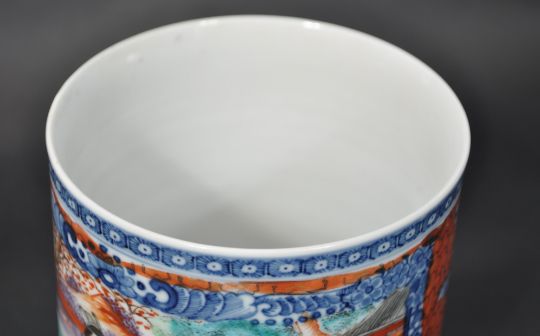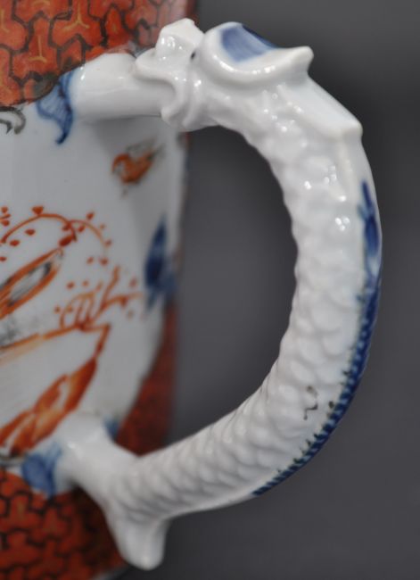 A believed 19th century Chinese large  mug decorated with geometric Mandarin pattern red ground with  a large central  panel decorated with family scene and finished with blue and white flower head borders, dragon serpent handle to side. 13cm tall.