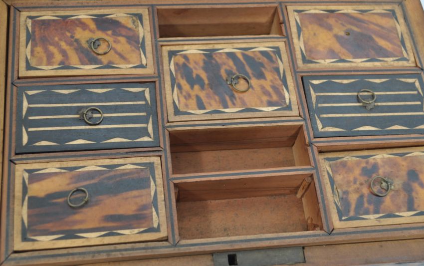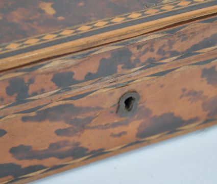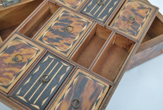 A good 19th century Victorian tortoiseshell ladies work box. Of rectangular form having hinged top, all heavily adorned with tortoiseshell panel work and inlaid borders. The interior being appointed with sectional compartment interior. Measures 9cm high x 28cm wide x 19cm depth.
