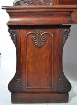 A 19th century Regency mahogany twin pedestal sideboard. Raised on twin pedestals with plinth bases and flared arches to the locker doors housing shelves within. Above a large flared sideboard top with blind fronted drawers, the central drawer with embellished details. Finished with a carved and arched gallery back. Measures 126cms high x 199cms wide x 61cms depth