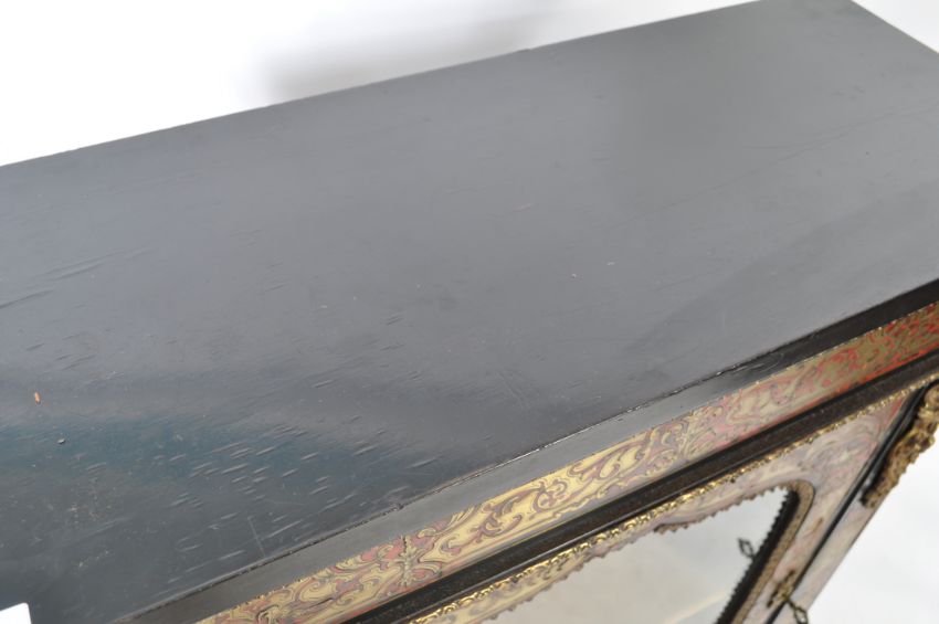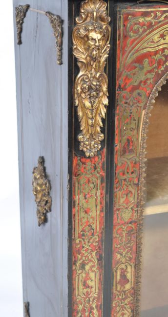 A 19th century Napoleon III ebonised boulle and ormolu mounted pier cabinet, circa 1860. A Napoleon III ebonised, boulle and ormolu mounted pier cabinet , circa 1860, Flared rectangular top above a  single glazed door enclosing line shelves and plinth base The sides with applied ormulu masks and borders,