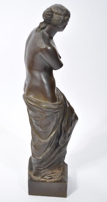 A stunning large bronze sculpture of ' Aphrodite at Milos ' or ' The Venus de Milo ' standing in typical classical pose having upper body naked with the lower body draped, all set on a square plinth. Measures 65cm high x 17cm wide x 14cm deep.