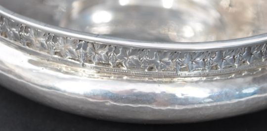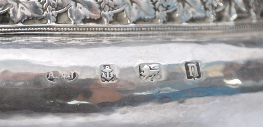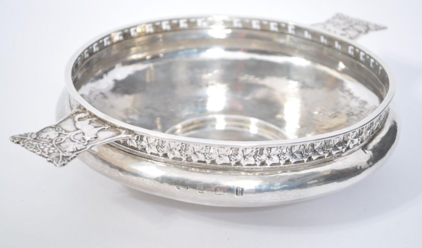 A silver hallmarked A. E. Jones silver Arts and Crafts twin handled bowl, of compressed form with a neck rim pierced with vine leaves and grapes, the handles each cast depicting Aesops fable of the fox and the grapes. Total width 27cm, with maker's marks for Birmingham 1912 Weighs 365 grams. ( A E Jones )