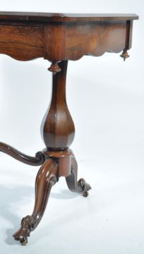 An exquisite 19th century rosewood writing table desk. Raised on hexagonal baluster columns united by turned stretchers with splayed feet. Above a fitted frieze with single blind fronted drawers with flared chamfered edge desk top. ( The item originally booked and confirmed to be a filmed exhibited item of furniture on the antiques roadshow 10 years ago by the vendors family). H74cm x W102cm x D58cm