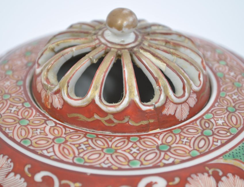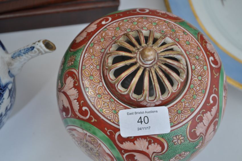 A 19th century Chinese / Japanese tri-colour ball base raised on tripod feet having cartouche panel of 4 toed dragon, decorated with peony flowers elsewhere having a pierced finial top lid above. Measures 6cm.