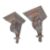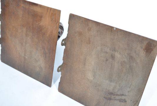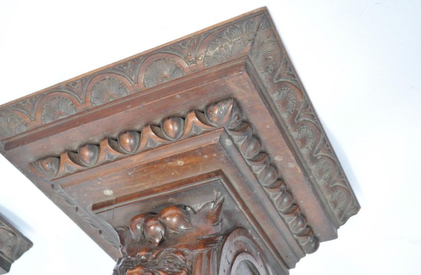 A pair of 19th century large solid walnut carved wall brackets rising from inverted finial bases through s-scroll bodies having grotesque human masks to the front culminating in sectional gadrooned terraces atop. H40cm x W30cm x D29cm