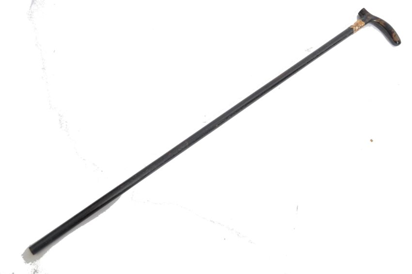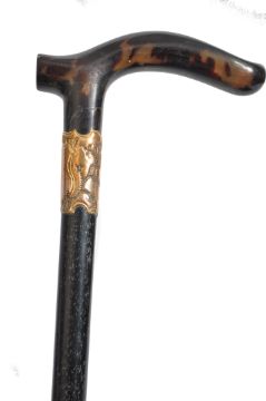 A 19th century Victorian walking stick cane having a tapering ebony shaft with shaped tortoise shell handle. The 9ct gold collar having an armorial shield cartouche. Measures 85cm.