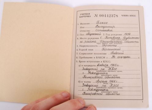 An original Cold War Soviet Union Communist Party record Member's booklet. Deemed 'Officially Destroyed'. Contains ID information as well as photograph. Rare.