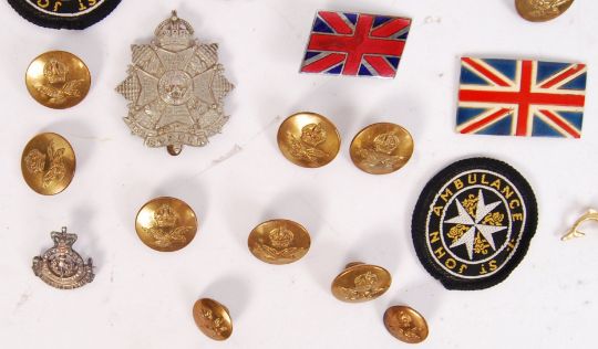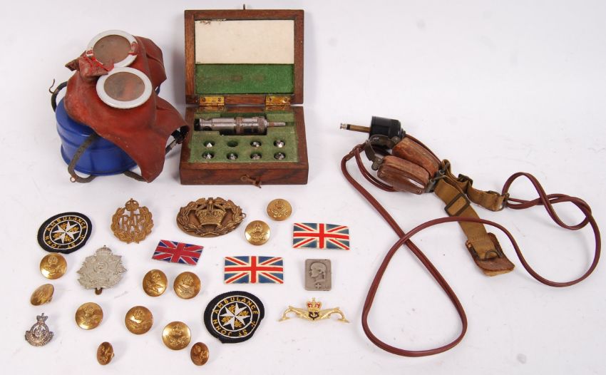 A collection of vintage post-WWII Second World War items to include; aircraft throat microphone, Vanmar Mark II 1959 IC6456 Countersink set, uniform buttons, RAF hat badge, St John Ambulance badge, The Border Reg, etc.