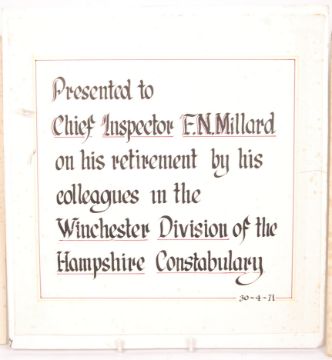A collection of 1950's & 1970's Police Service ephemera, relating to the Hampshire Constabulary, namely Chief Inspector F.N. Millard to include; retirement card from his colleagues in the Winchester Division of the Hampshire Constabulary with various signatures to reverse., Aldershot Division 1950 group photo & Detective Constable Training School 1951 group photo with names present to bottom. Both photos measuring 39cm wide.