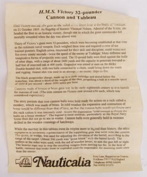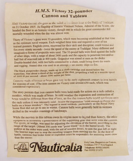 An original Nauticalia made HMS Victory 32 pounder model cannon & tableau to include miniature cannon balls & information leaflet. Appears to be complete. Measures approx 39cm long.