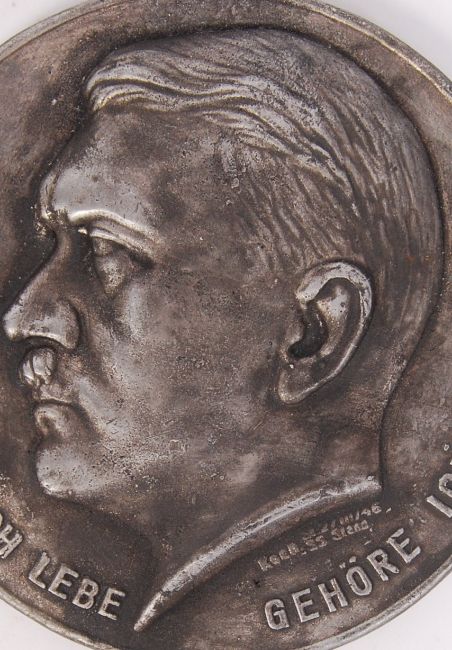 A 20th century Nazi German Third Reich aluminium wall plaque with Adolf Hitler's head to centre with ' Solance Ich Lebe Gehore Ich Euch ' ( As Long As I belong I Live) below. Measures approx 18cm in diameter.  NOTE: From a private collection of German militaria comprising of both genuine and replica items. Where possible we have stated ‘original’ or ‘replica’ but buyers are strictly reminded to satisfy themselves prior to bidding as to authenticity / condition irrespective of the description. As long as I Belong Live I you As long as I Belong Live I you