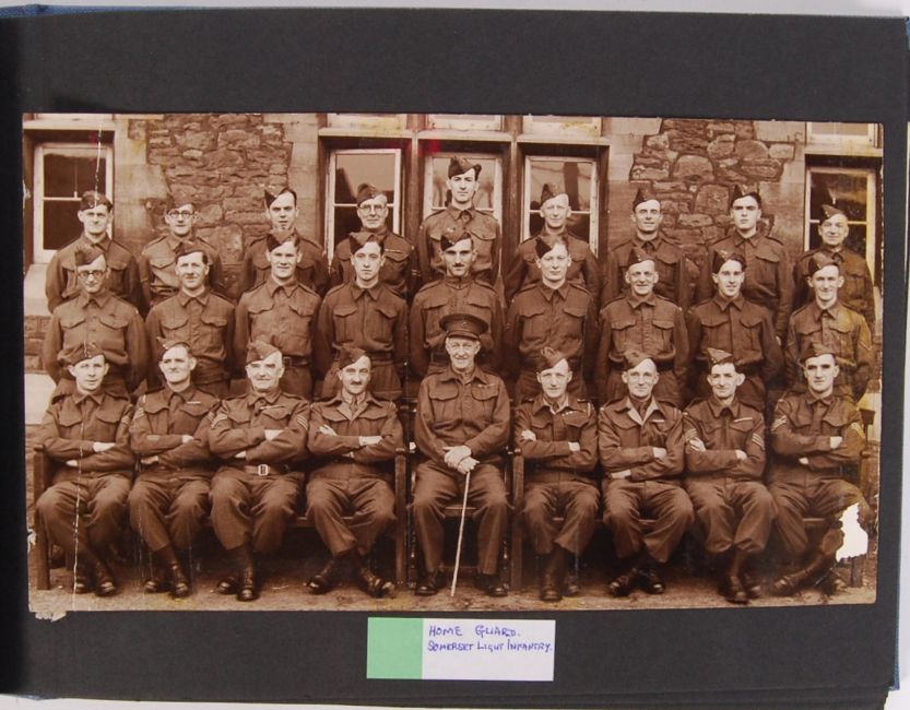 A photo album containing approx 28x photographs of WWII Second World War servicemen & group photos of; the Somerset Light Infantry Home Guard, Enemy Equipment Anti Aircraft, soldiers outside barracks, military hockey team, servicemen & their wives & others.