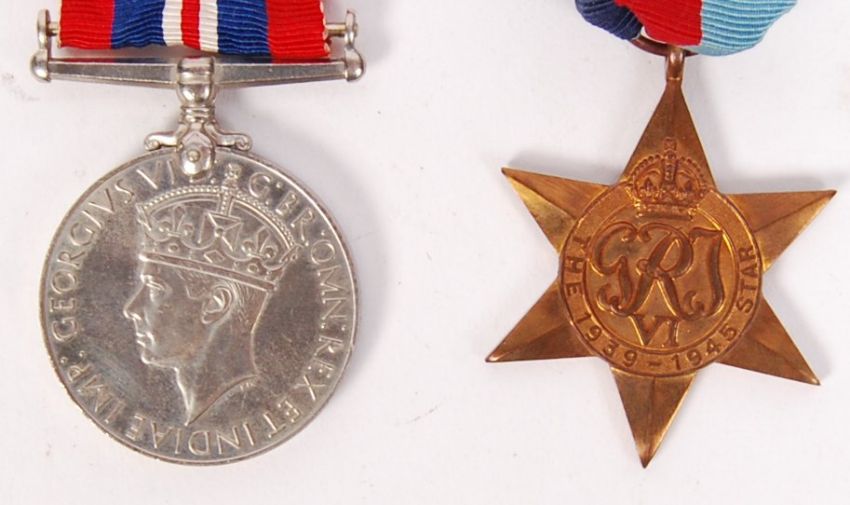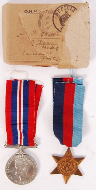 A pair of original WWII Second World War medals belonging to Mr Greaves of Lawrence Hill, Bristol comprising of 1939- 1945 War Medal & 1939- 1945 star. Both on their original ribbons & within the original box.