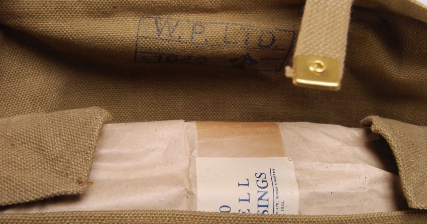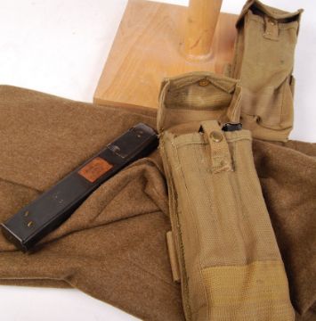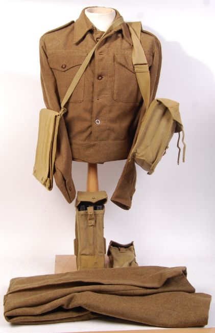 An original WWII Second World War British uniform together with a Johnson & Johnson 1944 First Aid bag with unused shell dressings inside, officers canvas map case (still retaining the original pencils and ruler in miles & inches), 2x rare Sten gun / machine gun magazine pouches, one of which contains three empty magazines.
