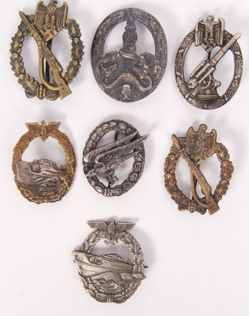 A collection of 7x presumed reproduction WWII Second World War Nazi German Third Reich uniform badges / awards to include; E Boat badge, Infantry Assault, Guerilla Warfare badge, E Boat Type 2 badge, Parachutist badge, Army Anti Aircraft badge & Infantry assault badge. NOTE: From a private collection of German militaria comprising of both genuine and replica items. Where possible we have stated ‘original’ or ‘replica’ but buyers are strictly reminded to satisfy themselves prior to bidding as to authenticity / condition irrespective of the description.