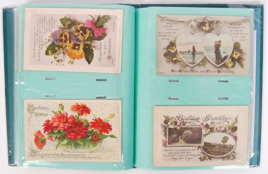 A album containing approx 80x original WWI First World War postcards, greetings cards & sweetheart cards of scenes to include; weddings, English countryside, church services, injured servicemen & others.