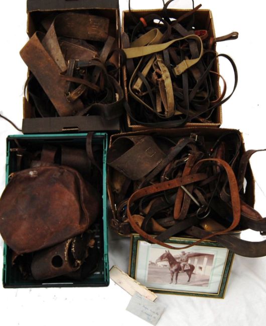 A large and interesting collection of vintage c1930's horse tack / equine accessories. All relating to a Norman Dayer-Smith, personal aide to the Royal Family in the 1920's. By family repute, he was said to have 'taught Queen Elizabeth & Princess Margaret how to ride horses.' Being a general aide to the Royal Family, but later stable master at Buckingham Palace (and other Royal residences) due to his love and work with horses. The collection features various leather straps, muzzle, buckles, stirrups, a pair of Dayer-Smith's working boots and other related items, all from the stables at Buckingham Palace. Included as provenance are also; a personal photograph of Dayer Smith taken in the private gardens at Buckingham Palace (presumably accompanied by one of the Royal Alsatians), a private note on headed Prince George notepaper which reads ' HRH Prince George thanks Mr. Dayer Smith for changing the number & requests him to send the charwoman to clean up on Tuesday morning. If she cannot, then Wednesday morning, & would she send the washing too.' The note being unsigned, is presumed to have been written by someone close to Prince George, or possibly by George himself. Also included, and of military interest, is a recommendation for war duty (WWII) from Windsor Castle, presumably some time after his work with the Royal Family. On headed paper, and signed by Ulick Alexander, Keeper Of The Privy Purse. Passages including; 'Mr Dayer Smith...has been responsible for the inventories of Their majesties private effects at The Royal Lodge for some years, and, apart from these duties, has carried out other work for Their Majesties with every satisfaction.' 'Mr Dayer Smith held a commission in the last war in the Cheshire Regiment and was on the Regular Reserve of Offices until..1938.' Another recommendation from ' Rear Admiral BV Brooke ' follows. All housed within the original envelope. Finally, a reproduced photograph of Dayer Smith atop a racing horse. Framed and glazed.  A fascinating and important collection.
