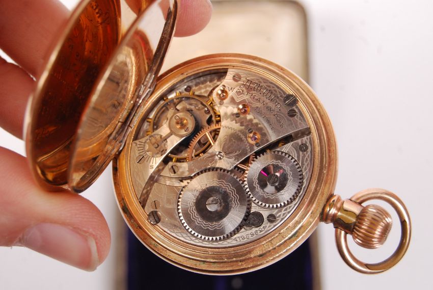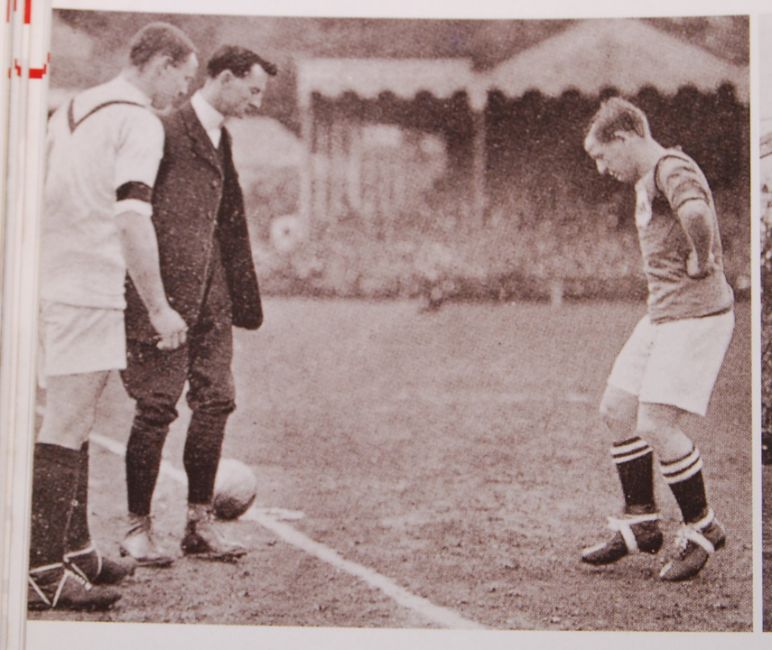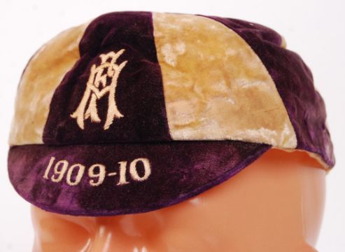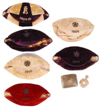 An incredible and rare collection of Edwardian England Football caps and personal effects, presented to one of Bristol's most famous footballers.  William John 'Billy' Wedlock (often referred to as ' Fatty ' Wedlock, or ' The India Rubber Man ,') played for Bristol City from 1900-1901 and then from 1905-1921 when he retired. From 1901-105 he played for Aberdare. Between 1907 and 1914 he won 26 England caps. His short and stout built, gave him the nickname 'Fatty.' So famous was he, that until recently, the East End Stand at the Ashton Gate Stadium was named ' The Wedlock Stand .' Upon retirement, he owned and ran ' The Star ' public house outside the stadium, which after his death, was renamed ' The Wedlock ' (now demolished). He completed 403 league appearances in his time.  When the First World War was declared in 1914, it was expected that the Football Association would follow the example soon set by cricket and cancel all matches. But, despite opposition, matches were played in the Football League throughout the 1914-1915 season and the FA Cup held as normal. For the remainder of the war, the Football League suspended its programme but allowed clubs to organise regional competitions. There are several known examples of Wedlock receiving an official exemption from War Duties (one such is shown in the last image). Rumoured initially to be due to his importance in keeping morale high in the City, but later due to family concerns and him being the father of seven 'motherless children.'  By the time the war ended in 1918, he was too old to return to high-profile matches and never played for England again, but did continue to play for Bristol City until 1921.  This lot includes; Wedlock's gold-plated pocket watch engraved to verso with ' WW ' monogram and neatly engraved to the inside ' Presented to W. Wedlock By His Friends At Aberdare, In Recognition Of Gaining All English International Caps 1906-7-8, April 30th 1908.' Within an associated case, in working order.  His British Championships International 1909-1910 cap in maroon and cream. Embroidered 'FA' logo to front, and '1909-1910' embroidered to the peak. Hat size ' 6 7/8' still present to inner. Minor pen annotation inside, some fraying to rear seam.  Two 1909 England International caps. The first being purple velvet, with embroidered rose motif to top and '1909' date. Some fraying to rear, minor pen annotation to inside top. The second in cream, with fraying also to the rear.  All three of his 1910 International England caps - purple, red and cream - denoting matches against Ireland, Scotland & Wales respectively.  The collection also comes with a selection of reproduced photographs, articles and books relating to Billy. A selection of these excerpts can be found in the final few photographs of this description, including a photograph taken from a book which features Wedlock accompanying his caps on an official Bristol City postcard of the era.  A rare, and historically important collection of Bristol City / England football memorabilia.